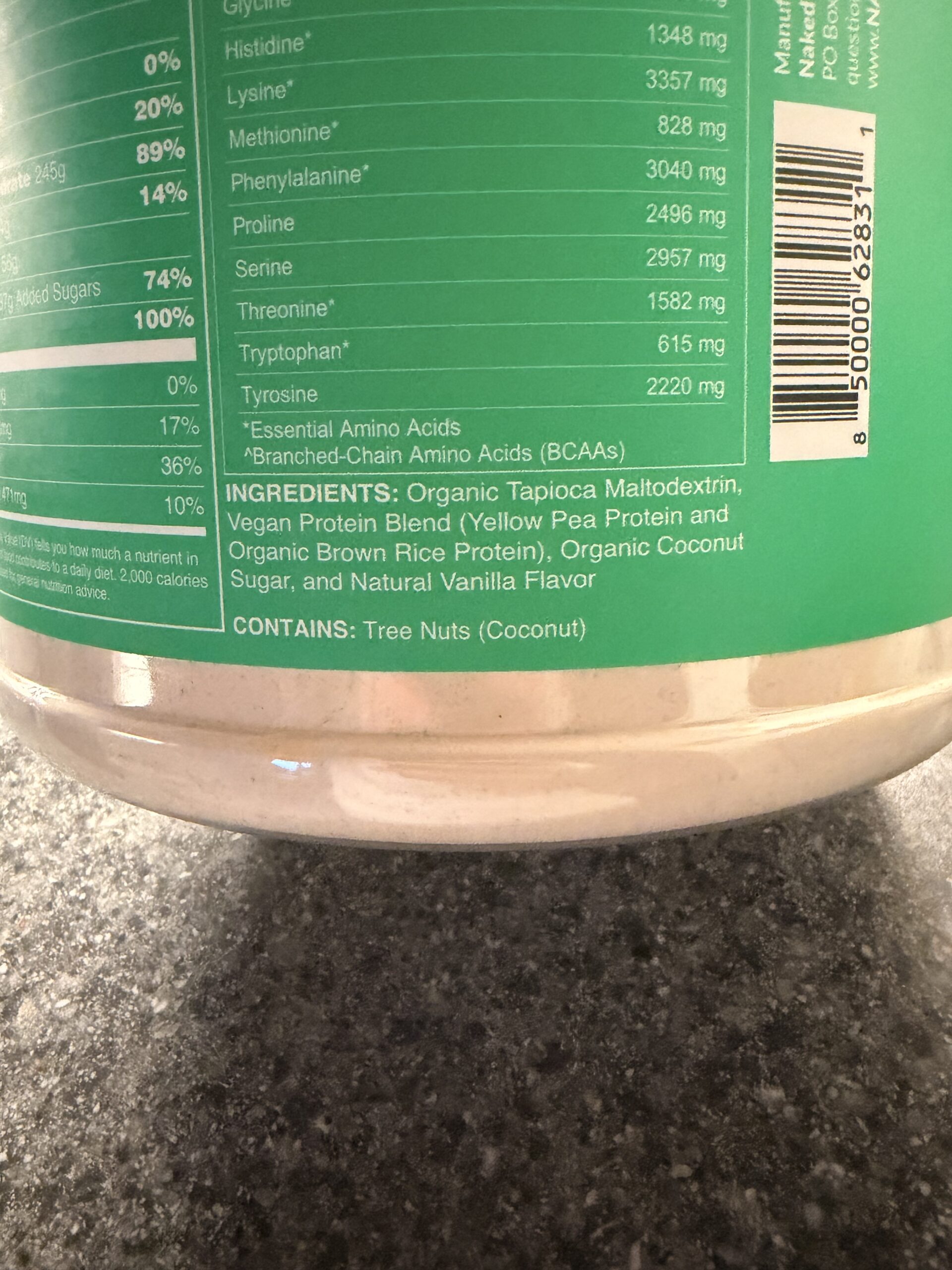 INGREDIENTS: Organic Tapioca Maltodextrin, Vegan Protein Blend (Yellow Pea Protein and Organic Brown Rice Protein), Organic Coconut Sugar, and Natural Vanilla Flavor